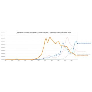 Испанский язык является родным для более 470 миллионов человек, а говорящих на испанском языке - более 548 миллионов человек. В самой Испании проживает только около 10% говорящих на испанском языке. Несмотря на большое разнообразие испанидада, указание на саму Испанию встречается гораздо чаще, чем на другие страны. На таблице №19 видно, как традиционный интерес к европейским странам в испаноязычной среде опосредован интересом к ситуации в Мексике и Кубе, Колумбии и Чили. А почти одинаковый интерес к ситуации в Латинской Америке в целом, России, США и Китаю указывает на определенные геополитические позиции испаноговорящих. Таблица №19 Таблица частоты указания на ситуации в странах испанского сегмента Google Books (%) Многообразие испаноязычного мира очевидно. Но существует ли что-то, объединяющее испаноговорящих жителей планеты? Во-первых, говорящих на испанском языке можно уверенно отнести к группе, ориентированной на фактический сценарий управления ситуациями. Таблица №20 демонстрирует одну из самых высоких частот указания на "фактическую ситуацию" (situación de hecho»). "Фактическая ситуация" у испаноязычных уступает только частоте указания на «ситуацию зависимости» (situación de dependencia), «кризисную ситуацию» (situación de crisis) и положение женщин (situación de las mujeres). Таблица №20 Таблица частоты употребления содержательных словосочетаний со словом situación в испанском сегменте Google Books На диаграмме №21 видна инверсия "фактической ситуации" и "ситуации зависимости". Видно, что произошло это в самом начале ХХI столетия (в 2002/2003 г.г.), когда указание на фактическую ситуацию как бы "уступило" первенство указанию на ситуацию зависимости или на зависимое положение. На деле это означает признание фактической ситуации в качестве "ситуации зависимости". Это символизирует 59 позиции таблицы, которая в переводе звучит как "ситуация зависимости в Испании", а на испанском как "situación de dependencia en España" Диаграмма№21 Динамика частот указания на ситуацию в испанском сегменте Google books Зависимое положение понимается испаноязычными очень широко и не исчерпывается ситуацией экономической зависимости (36 позиция в таблице №20). Положение зависимости может расшифровываться в виде таких пар: «зависимости и доминирования», «зависимости и подчинения», «зависимости и эксплуатации», «зависимости и угнетения», «зависимости и отсталости». Достаточно много говориться о «зависимости и отсутствия автономии» (situación de dependencia y de la falta de autonomía), зависимости и «ситуационной двусмысленности» (situación de dependencia y de «ambigüedad situacional»). И речь тут идет не только об автономии общин, но и о персональной автономии. Это можно бы было трактовать как индивидуальные свободы, но это было бы не совсем точно. Суть противостояния Испанидада разнообразным формам зависимости, на мой взгляд, открывается через пару «зависимость и неполноценность» (dependencia y de inferioridad). Согласно испанским текстам, «состояние подчиненности, зависимости и иерархической неполноценности» (de inferioridad jerárquica) противоречит автономии и независимости, которыми должен обладать человек или организация, взявшие на себя какие-либо обязательства. Особенно это касается органов контроля и управления. Адекватно понять "иерархическую неполноценность" довольно сложно. Она присуща всем иерархиям или каким-то искривленным? Ответить на этот вопрос можно после допо