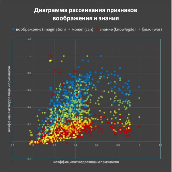 Откуда такая уверенность в направленности воображения в будущее? Самый короткий ответ: «Из грамматики английского языка». В английском языке глагол «can» (может) всегда используется в настоящем или в будущем времени. В прошедшем времени глагол «can» всегда модифицируется в глагол «could» (мог, могло). Проанализировав англоязычную дискуссию о высказывании Альберта Эйнштейна о важности воображения, мы обнаружили самую устойчивую коррелятивную связь между существительным «воображение» («imagination») и модальным глаголом «can» (может). В анализируемом тексте «человек с воображением» может: «создавать оригинальные работы, а не копии прошлого», «продвигать идеи, а не знания» или просто использовать его для «парения в радужных облаках». На мой взгляд, все это достаточно логично, т.к. возможность что-либо сделать и не может быть обращено в прошлое. А вот существительное «knowledge» (знание), наоборот, коррелирует с глаголом «was», который используется в прошедшем времени (было что-то сделано). Наиболее наглядно связь между словом «воображение» и глаголом «могло», словом «знание» и глаголом «было» видна на диаграмме рассеивания признаков. Слово «воображение» отмечено на диаграмме синим цветом, глагол «может» - зеленым, слово «знание» - красным цветом, а глагол «было» - желтым. В анализируемом тексте существительное «знание» было: «достигнуто благодаря прошлым актам воображения», либо «могло быть естественным образом перетасовано в зависимости от обстоятельств». Кроме того, важным отличием является то, что «воображение вообще не имеет ограничений, а ваши знания, очевидно, имеют». Воображение признается средством трансляции информации. В тексте это выглядит как «through imagination» (через воображение), когда люди могут «продвигать идеи» и «парить над радужными облаками». Знание же всегда обращено в прошлое, т.к. приобретается благодаря многочисленным уточнениям (refinement), «соизмерением с конкретными обстоятельствами» и другими фактами предыдущего опыта. Обращенность воображения в будущее - несомненно. Отсутствие воображения означает «отсутствие эволюции». Но, с другой стороны, «можно учить и передавать прежнее знание без воображения». Обращенность знания в прошлое и его копирование открывает его большую приспособленность к практике. Повторяемость и узнаваемость действий поддерживает уверенность в их надежности и безопасности. В этом аспекте воображение дополняет знание, как свобода дополняет безопасность. Люди лишенные воображения, делают ставку на безопасность и становятся тиранами. Но как назвать людей, делающих ставку исключительно на воображение, отрицающие знание, повторение и цикличность? Скорее всего, опасными фантазерами, живущими в «расходящихся мирах». Таким образом, воображение смотрит в будущее, но рискует впасть в фантазию, породив избыточные эмоции и беспокойство. Но это и риск любого линейного мышления, верящего в бесконечный прогресс. Наилучшим вариантом было бы воображение, способное развиваться в рамках естественных циклов. Упрощенный вариант циклического воображения – сказки или мифы, набирающие популярность даже в технологически продвинутом обществе. Сказочное воображение «зациклено» образами всем известных героев, но не сдерживает полет фантазии. Возможно, это и есть то представляющее фантазию начало, которого не хв